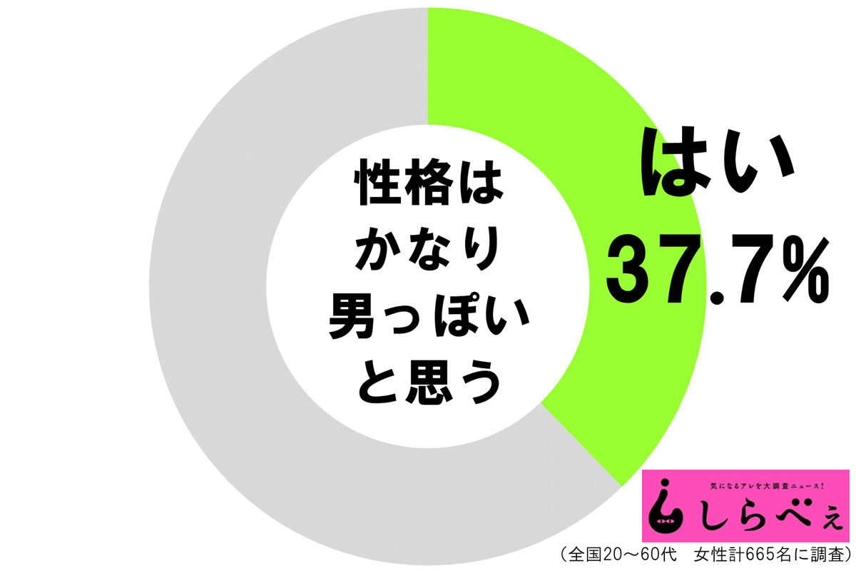 「男っぽい性格」と言われがちなサバサバ女子だが、しらべぇ編集部が全国20〜60代の女性665名に「自身の性格」について調査したところ、4割弱が「性格はかなり男っぽいと思う」と回答している。