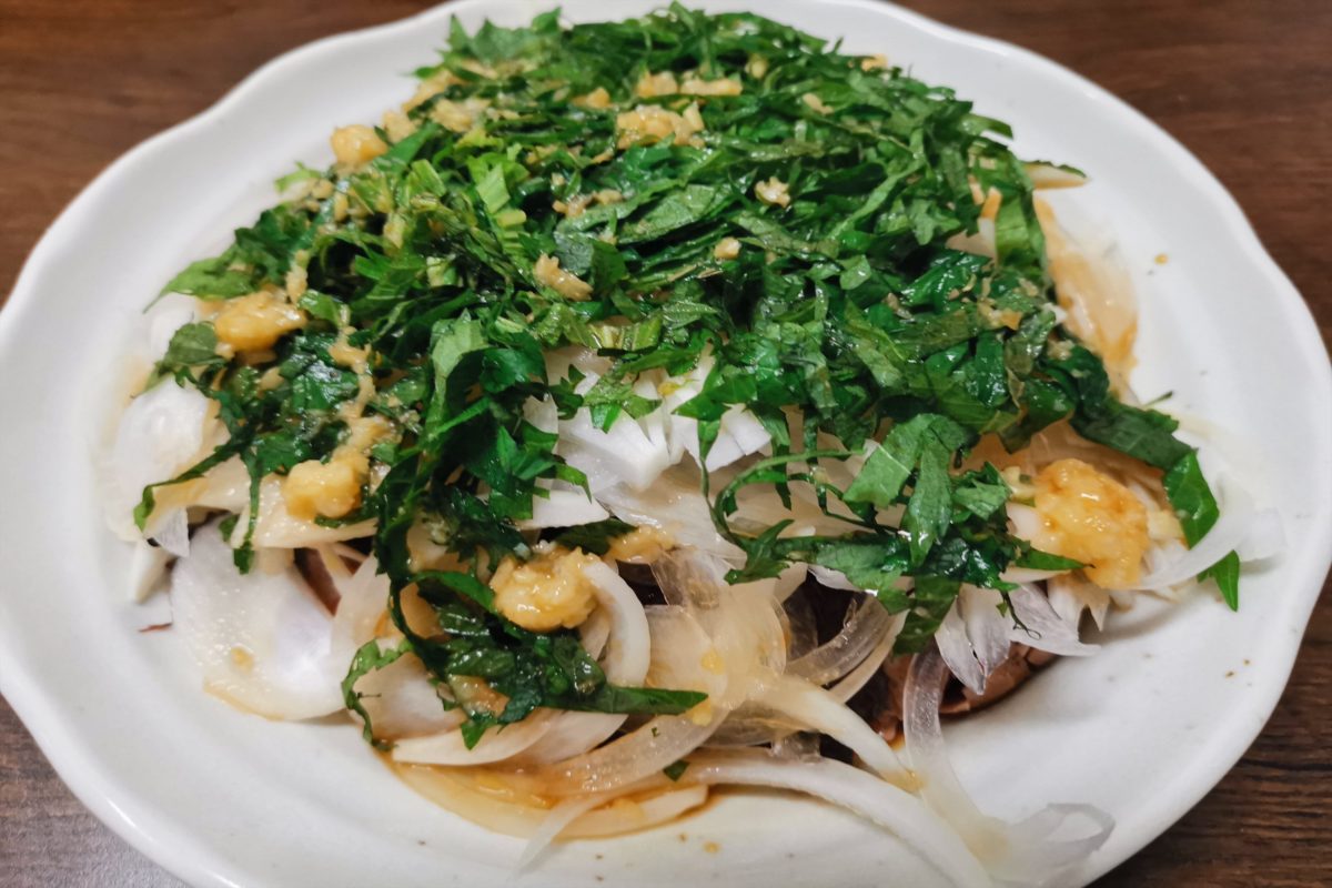 表面の塩をポン酢で洗い流し、薬味をのせれば完成だ。今回はたまねぎと大葉をたっぷりとのせ、たっぷりとポン酢をかけてみた。