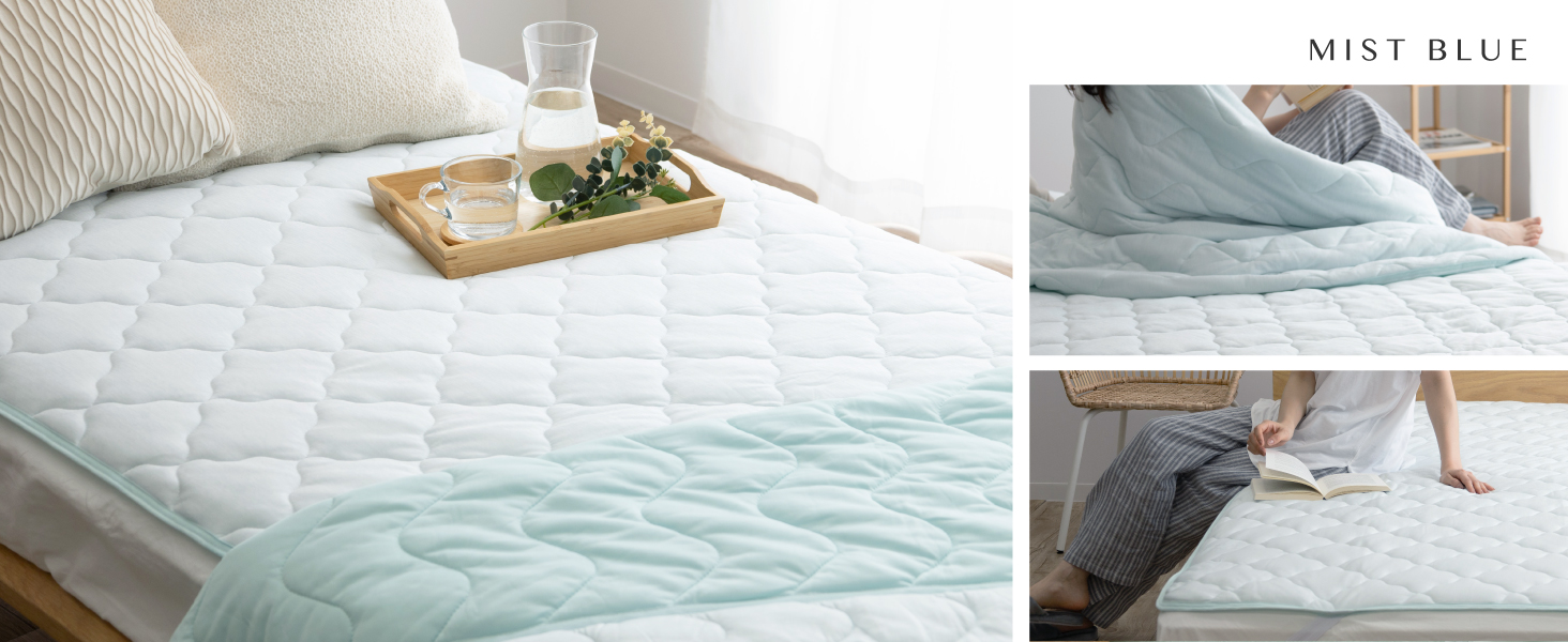 カラーはミストブルー、ミストグリーン、ミストブルーの3色。サイズはシングル〜ワイドキングまで展開されています。