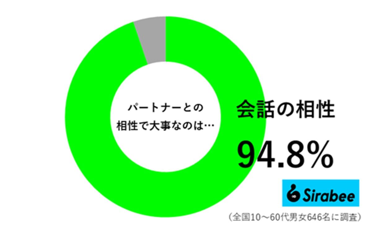 まずは、Sirabee編集部が「パートナーとの相性で大事なのはキスか会話か」について、アンケート調査を実施しました。男女671票の回答を得ることができ、男女94.8%が「会話の相性」と回答しました。